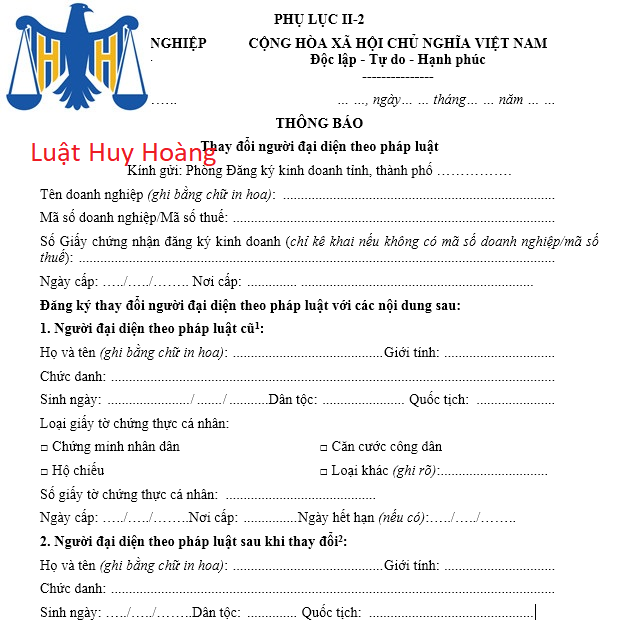 Bước 2: soạn hồ sơ thông báo thay đổi người đại diện. Công ty Luật Huy Hoàng cung cấp thủ tục soạn thảo, hỗ trợ soạn thảo hồ sơ.